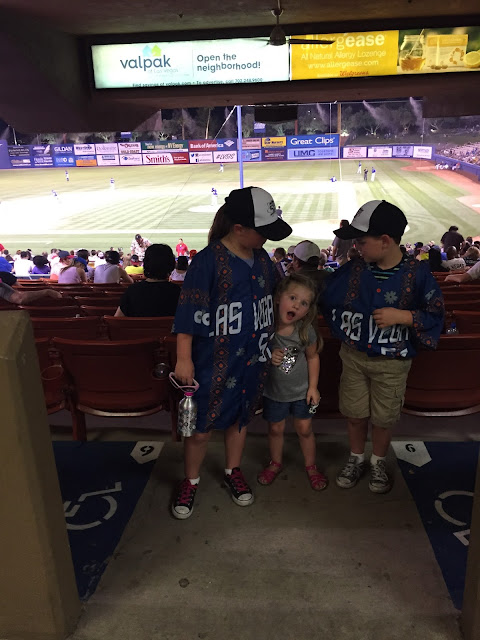 The whole family went out to a 51s baseball game and braved the heat for at least 6 innings before we headed home. I think we would go to more games if it wasn't so dang hot. Free hats and jerseys, combined with shaved ice made for a great time! The kids really had fun!